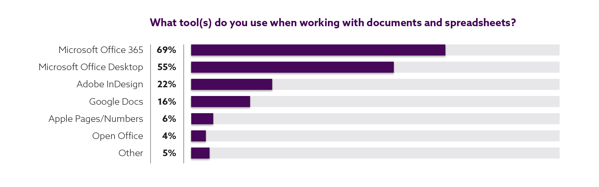 Microsoft’s online version of its office software was the most used tool (69%) for using documents and spreadsheets, well ahead of its desktop counterpart (55%). It shows how much technology and information management has changed over the last decade, as we move increasingly to working in the ‘cloud’.