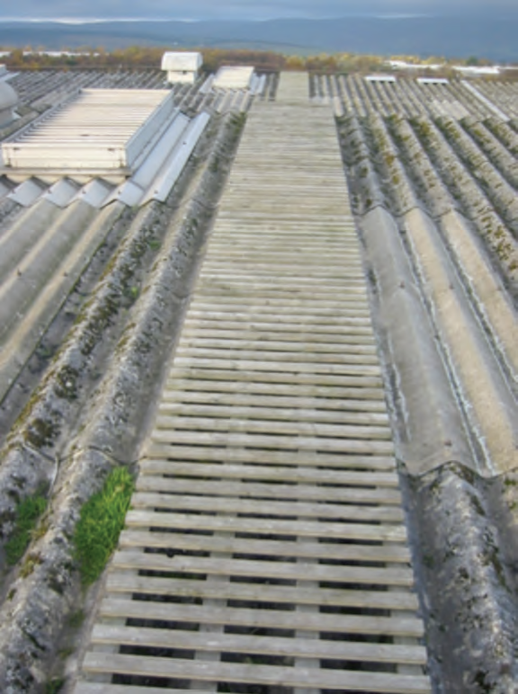 Having safely got to the higher elevations there are some basic do's and don'ts, particularly on roofs. At all levels, particular care must be taken around edges and penetrations; don't be tempted to walk backwards to capture that important photograph unless you have ensured a clear route and that any penetrations or holes in the floor have edge protection. Fragile roofing, e.g. asbestos and rooflights, should not be walked on. Under certain light conditions it may be difficult to differentiate between the sound roof surface and the fragile rooflight. Where provided, always use dedicated walkways around roofs, Photograph 2. Don't be tempted to walk along valley gutters, they may offer a convenient route across the roof but they represent a slip hazard and the exposed edges of sheet metal or asbestos are a considerable cutting risk. Another reason for those stout safety boots!