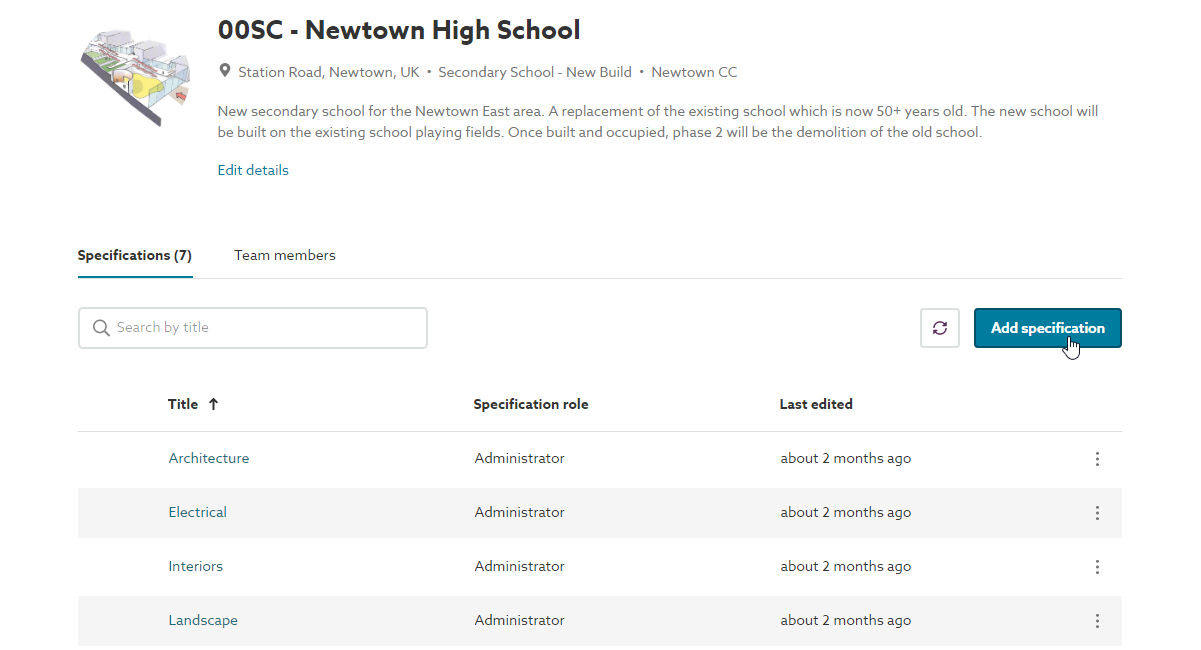 Consider a typical project in which the main specifications are split by discipline. For this particular project, the architect is specifying a green roof and would like assistance from a manufacturer. Figures 1 and 2 below show how this architect can add a temporary specification to their project within NBS Chorus.
